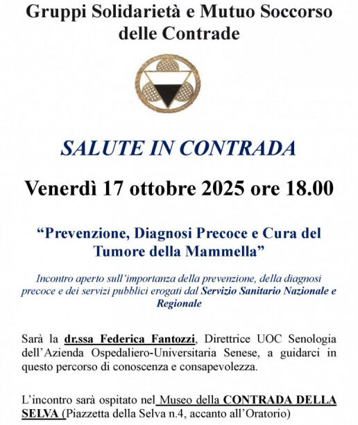 L’autunno si apre, dunque, con un nuovo incontro dedicato alla salute delle donne: dal titolo “Prevenzione, diagnosi precoce e cura del tumore della mammella”, l’appuntamento è in programma venerdì 17 ottobre alle 18 e sarà ospitato dalla Contrada della Selva negli spazi del Museo.