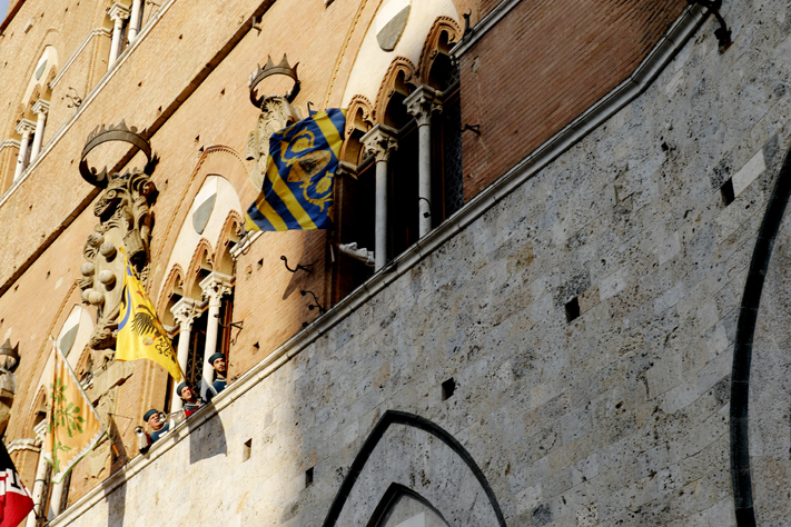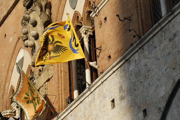 Al secondo piano di Palazzo Pubblico sono state esposte le bandiere di Chiocciola, Nicchio, Oca, Drago, Lupa, Istrice e Valdimontone (che sconta il provvedimento di esclusione).