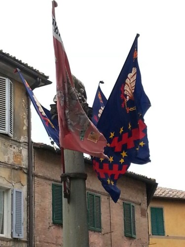 Mi riferisco, in particolare, non solo a quanto stabilito in tale Regolamento (cfr. Parte III, secondo capoverso punto a) circa l’osservanza – attualmente violata – delle vigenti norme tese a salvaguardare Piazza del Campo dalla esposizione e/o dalla apposizione di ogni e qualsiasi simbolo da parte delle singole Contrade (bandiere, bacheche, braccialetti, ecc.), ma soprattutto sulla opportunità di dover disciplinare la esposizione degli storici gonfaloni dei Terzi di Città e, di conseguenza, di rendere uniforme le modalità di utilizzo delle tre diverse colonne lapidee ubicate in Piazza Postierla, Piazza Tolomei ed al Ponte di Romana.