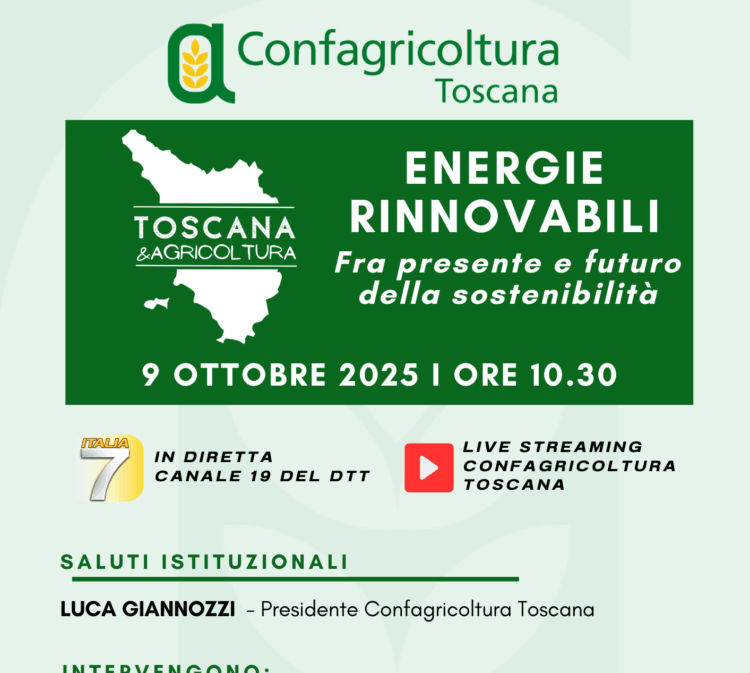 FIRENZE. “Energie rinnovabili. Fra presente e futuro della sostenibilità” è il confronto che andrà in onda giovedì 9 ottobre alle ore 10.30 su Italia 7 (canale 19 del digitale terrestre) e in diretta streaming sul canale YouTube di Confagricoltura Toscana. A promuoverlo è l’associazione di rappresentanza degli agricoltori toscani, che vuole aprire un confronto sul ruolo delle imprese agricole nella transizione energetica, tra strumenti disponibili, esperienze già avviate e prospettive future.
