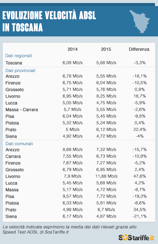 A livello regionale la velocità dell’ADSL in Toscana, nel 2015, scende del 3,3% rispetto all’anno precedente, attestandosi intorno ai 5,88 Mb/s. A livello provinciale, invece, sono state registrate alcune variazioni significative rispetto al 2014, non tutte positive.
