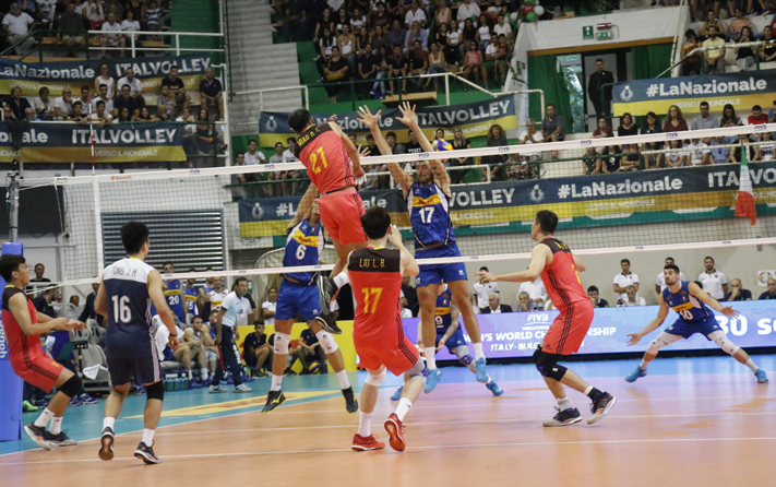 Secondo set Gli azzurri iniziano il secondo set con un altro piglio. Bene gli schiacciatori, con Lanza autore di una splendida pipe, e anche i centrali con Anzani che si fa valere. Ed è ancora Anzani a rendersi protagonista, questa volta dai nove metri: il suo ace vale il 13-9. Ancora i centrali sopra le righe: Mazzone blocca l’attacco cinese ed è 14-9. Poi con l’aiuto della rete Ivan Zaytsev in battuta pochi istanti dopo fa 15 (a 9). Ora gli azzurri danno spettacolo e Juantorena va a segno dalla seconda linea. Mazzone è in buonissima serata: un altro suo tocco permette alla squadra del ct Blengini di mantenere i sei punti di vantaggio e di portarsi sul 17-11. Lanza e Zaytsev producono punti su punti e in questo frangente di match diventa arduo difendere per la Nazionale cinese. Il tocco di seconda di Giannelli dà il primo set point all’Italia (24-17). Il parziale viene chiuso da una poderosa schiacciata di Juantorena (25-18).
