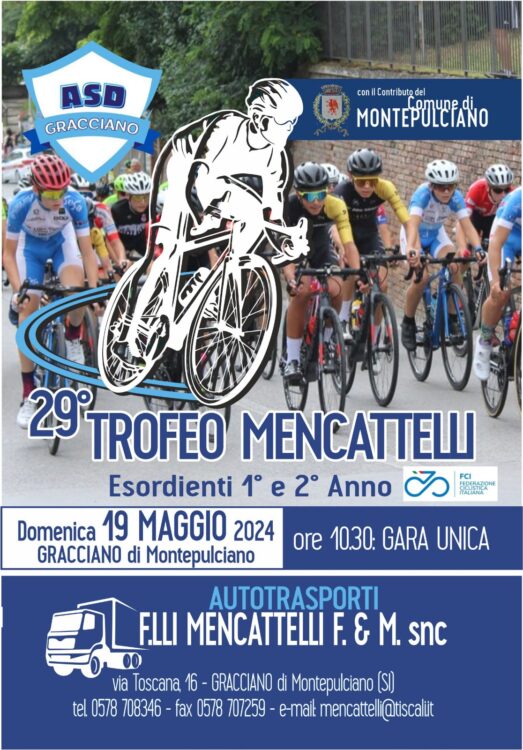 GRACCIANO DI MONTEPULCIANO. Gracciano e il ciclismo giovanile, un connubio che va avanti dai primi anni ’90 e che anche quest’anno vedrà ai nastri di partenza circa un centinaio di corridori provenienti da varie regioni. Domenica 19 maggio, alle 10:30 è prevista, da Gracciano di Montepulciano, la partenza della 29esima edizione del trofeo “Fratelli Mencattelli”, manifestazione organizzata dall’A.S.D. Gracciano e riconosciuta dalla FCI (Federazione Ciclistica Italiana). La gara è riservata alle categorie Esordienti 1° e 2° anno maschili.
