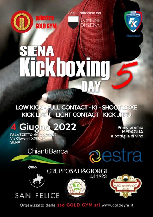 SIENA.  Sabato 4 giugno si svolgerà, presso il PalaOrlandi, il 5° Torneo “Siena Kickboxing Day” organizzato dalla sezione Kick Boxing della Palestra Gold Gym di Siena, per la Federazione Federkombat. La riunione avrà inizio alle ore 14 e vedrà la presenza di circa 50 atleti con relativi accompagnatori, provenienti da tutta la Toscana. Si terranno, nell’arco della giornata, una media di 30 incontri suddivisi su due tatami e un ring con diverse discipline: “low kick, full-contact, K1, kick light, light contact e kick jitsu” e diverse categorie: senior (dalla cintura blu alla nera), junior/senior (dalla cintura bianca alla verde), juniores (fino a 19 anni) e cadetti (fino ai 15 anni).
