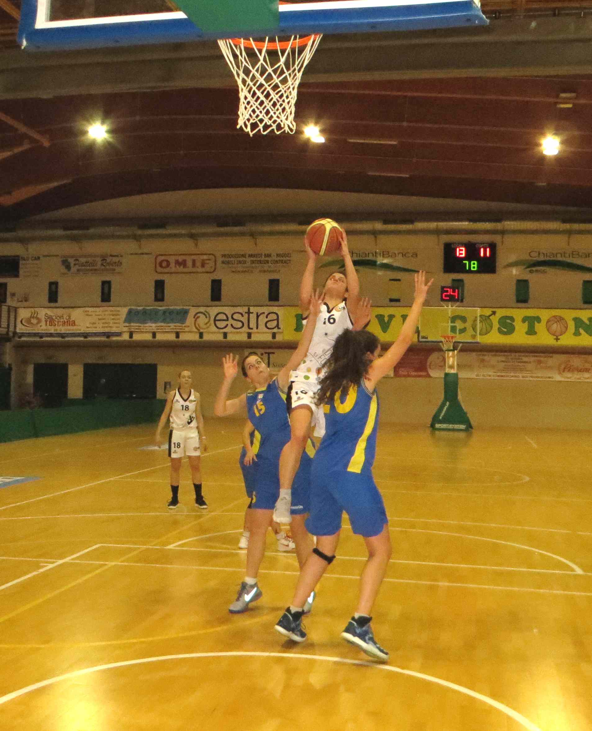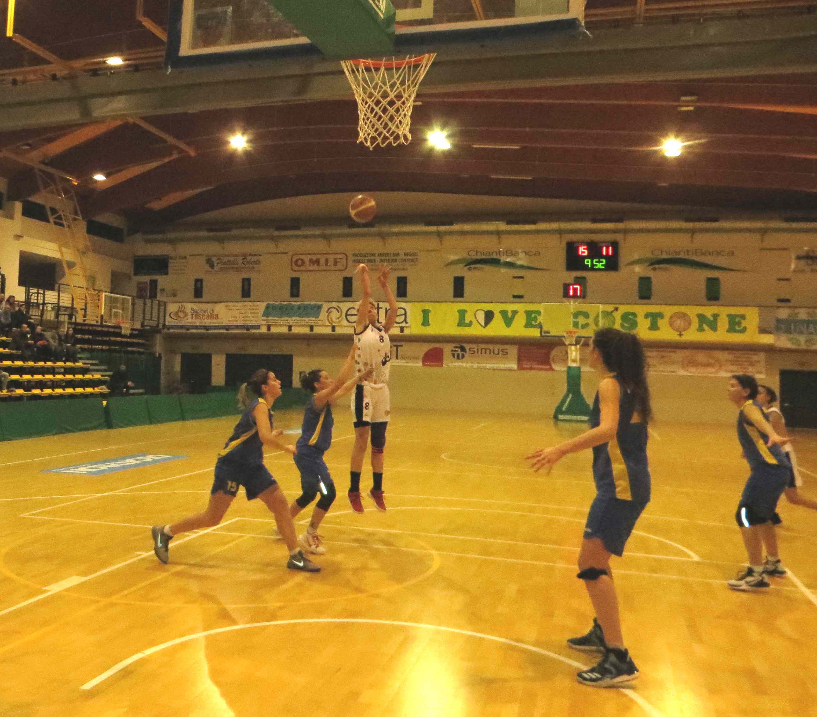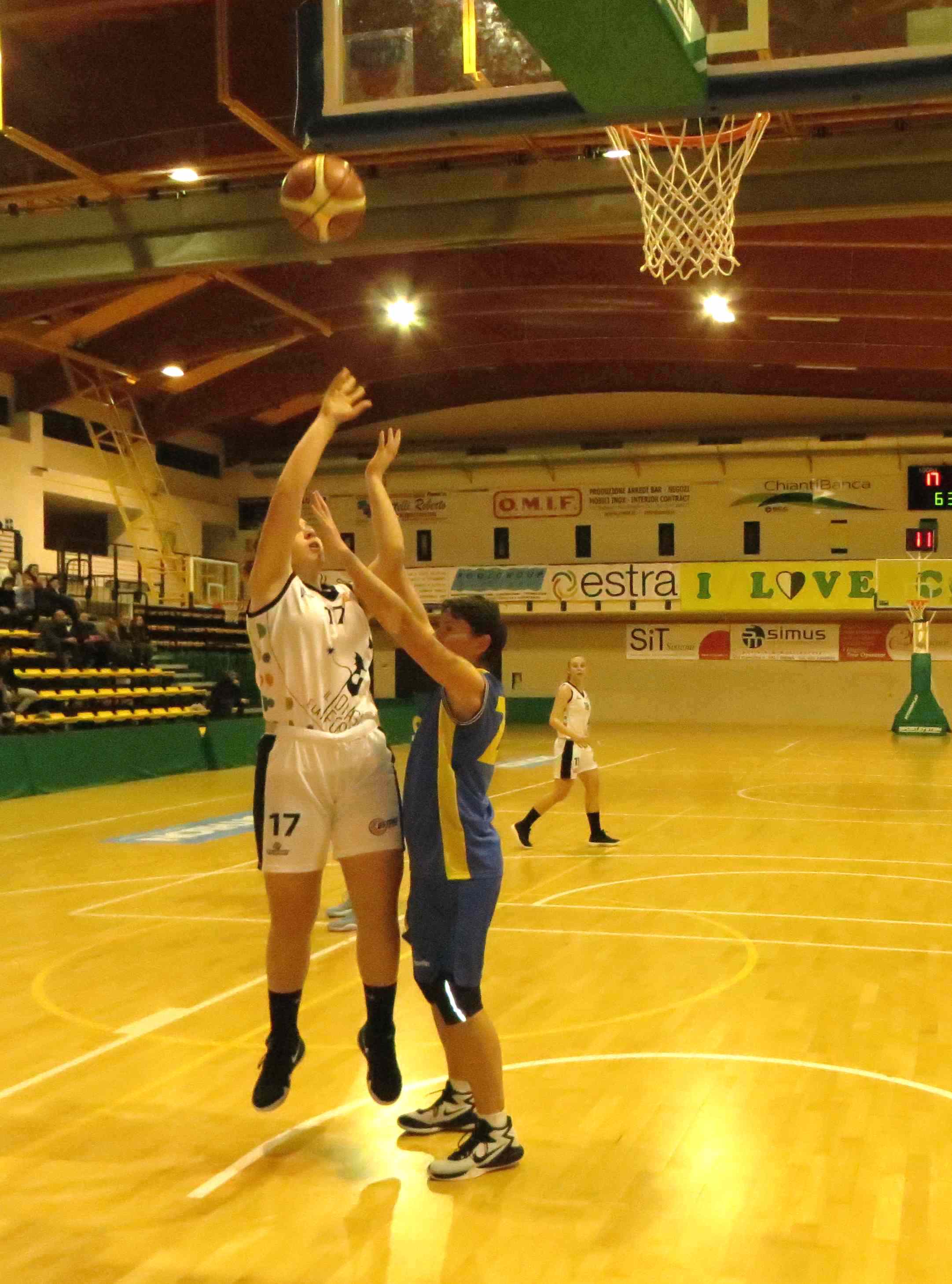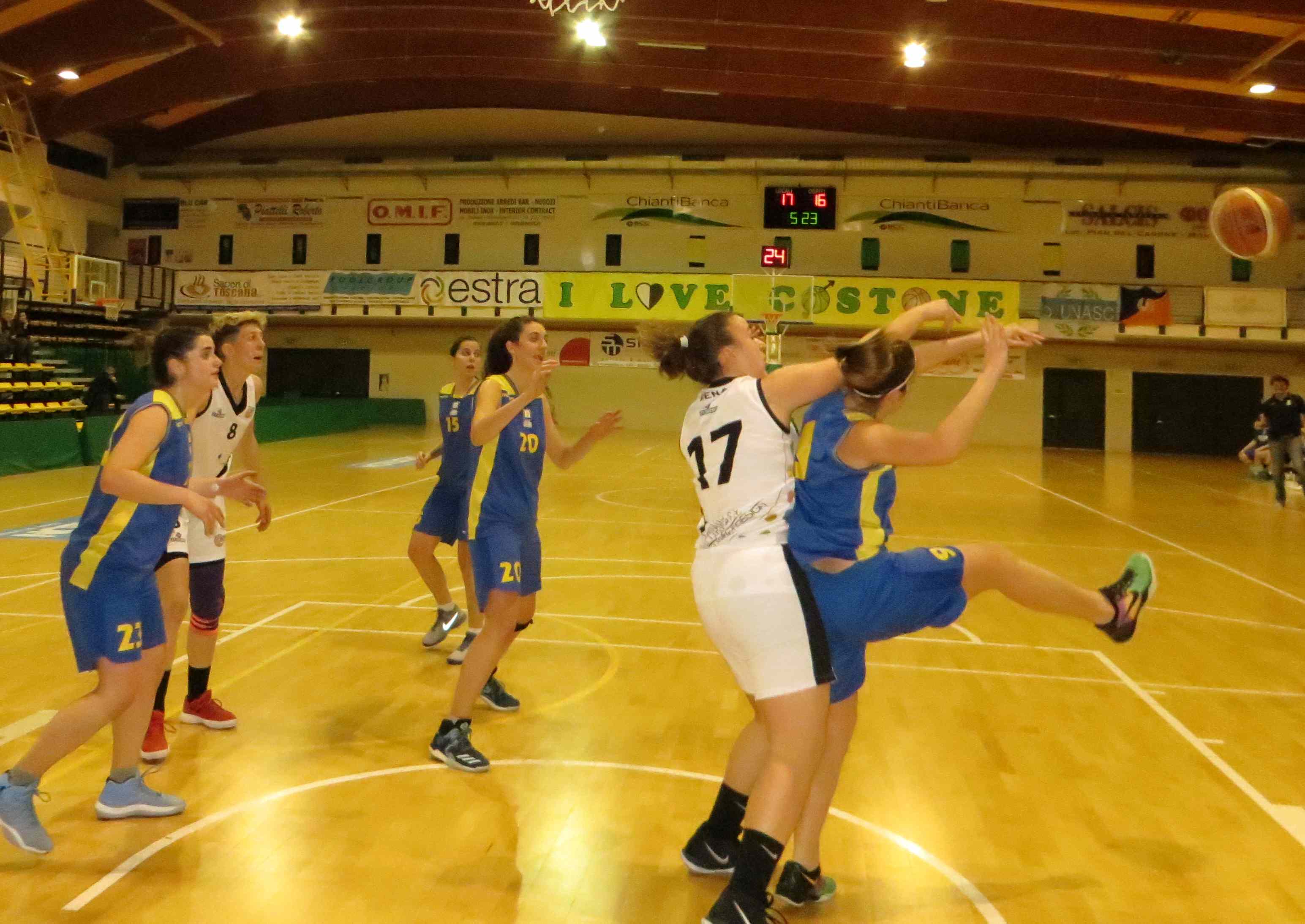 All’intervallo un solo punto divide le squadre, poi alla ripresa del gioco le ospiti si fanno intraprendenti portandosi sul 23-28 al 25′. La situazione non appare delle migliori, in quanto le costoniane accusano un calo di tensione; a questo punto anche coach Fattorini opta per una difesa a zona e il trend si inverte. Adesso è Siena a fare la partita, operando il sorpasso nella battute conclusive della 3^ frazione. Ultimo quarto senza storia dove il Costone, pur soffrendo, riesce a contenere la voglia di reazione delle valdarnesi che trovano però solo 2 punti, contro i 15 messi a segno dalle bianconere, con le varie Nosella, Oliva e una ritrovata Nardi.