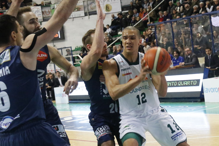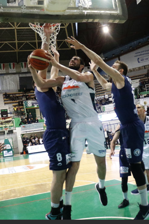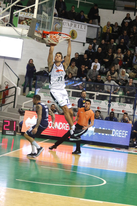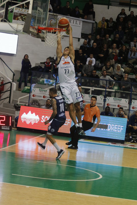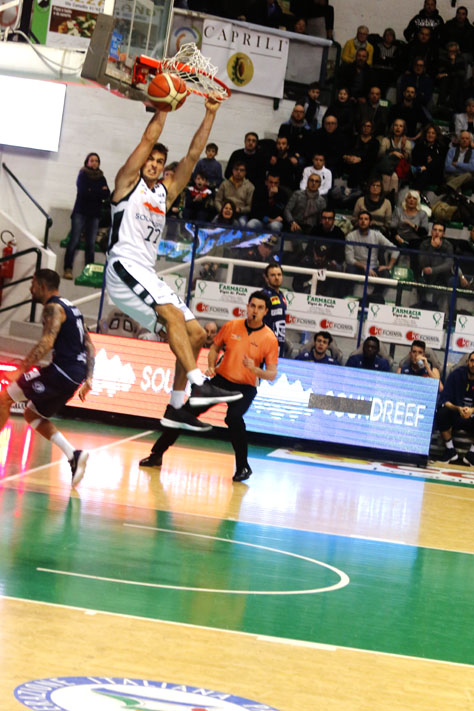 Sandri, poi Mezzanotte da tre: gara subito nel vivo. Poi due liberi per Ebanks al 22′; ancora una sequenza di errori delle due squadre e si torna a segnare con Pecchia a 6’15” dopo un non convalidato a Ebanks. La schiacciata in contropiede di Kyzlink mette tutti d’accordo, quanndo si supera il 25′; trenta secondi dopo il ceco ci aggiunge un tap-in 65-47 e il timeout di Vertemati è obbligato con 4’28”. Si riparte con una bomba di Ebanks +21. Un antisportivo a Vildera, con 2’55” non viene sfruttato bene da Dincic. Planezio realizza, e Kyzlink rimanda indietro l’assalto. La Soundreef è in totale controllo con contropiedi micidiali. Si chiude al 30′ sul 74-54.