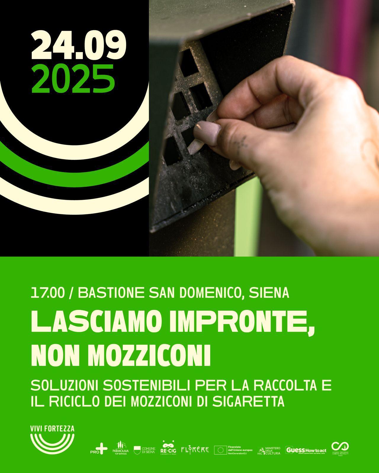 Alle ore 17,00, al Bastione San Domenico si terrà il primo incontro sul progetto Re-Cig “Lasciamo impronte non mozziconi: Soluzioni sostenibili per il riciclo di mozziconi di sigaretta”, a cui prenderanno parte Laura Zanchi di Propositivo, organizzatore di Vivi Fortezza, il direttore commerciale di Re-Cig, Fabrizio Schenardi, il presidente di Alleanza territoriale Carbon Neutrality Siena Simone Bastianoni, la coordinatrice della Fondazione Musei Senesi Carolina Taddei. Sarà un confronto sulla sostenibilità, il progetto Re-Cig dell’azienda omonima e la sua replicabilità