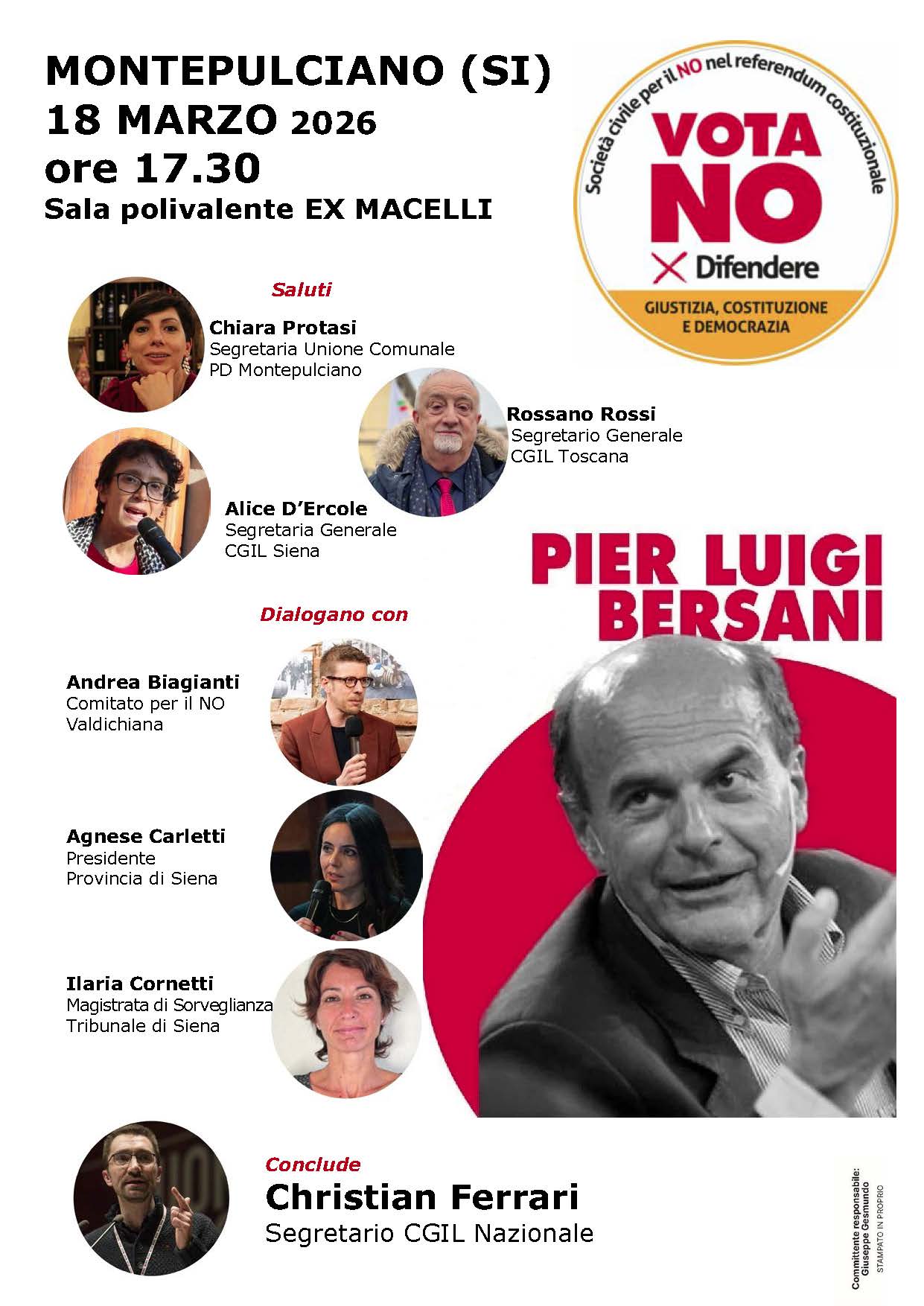 Dopo i saluti della segretaria dell’Unione Comunale del PD di Montepulciano Chiara Protasi, del segretario generale della CGIL Toscana Rossano Rossi e della segretaria generale della CGIL di Siena Alice D’Ercole, dialogheranno con Pier Luigi Bersani il referente del Comitato per il NO Valdichiana Andrea Biagianti, la presidente della Provincia di Siena Agnese Carletti e la Magistrata di Sorveglianza del Tribunale di Siena Ilaria Cornetti.