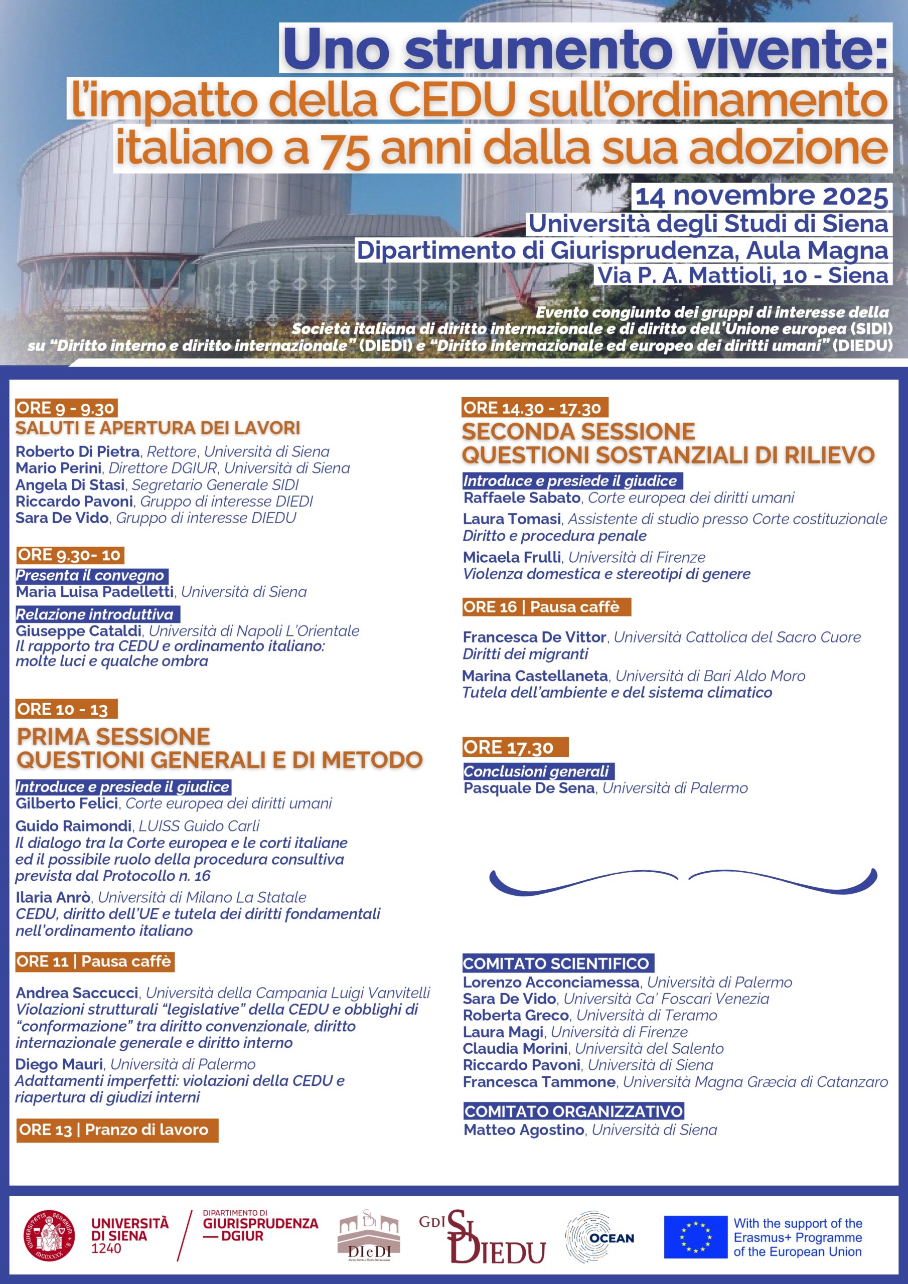 La giornata di studi è organizzata con il sostegno finanziario del programma Erasmus+ dell’Unione europea e della Società italiana di diritto internazionale e di diritto dell’Unione europea e con il patrocinio di OCEAN (The Open Council of Europe Academic Networks). Durante la stessa, saranno liberamente disponibili per i partecipanti vari materiali informativi e promozionali della CEDU forniti dalla Public Relations Unit del Consiglio d’Europa.