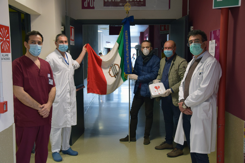 SIENA. Grande generosità da parte dell’Associazione Nazionale Mutilati e Invalidi di Guerra di Siena che ha donato due defibrillatori all’Azienda ospedaliero-universitaria Senese e, in particolare, all’area Covid del policlinico Santa Maria alle Scotte. «Siamo molto felici di ricevere queste attrezzature che rappresentano, ancora una volta, grande solidarietà e affetto. Sentimenti che la comunità di Siena rivolge all’ospedale e che noi contraccambiamo, con dedizione, impegno e spirito di servizio». Queste le parole di ringraziamento del direttore sanitario dell’Aou Senese, Roberto Gusinu, presente alla cerimonia di consegna insieme al presidente dell’Associazione Nazionale Mutilati e Invalidi di Guerra di Siena, Andrea Fontani, al responsabile dell’Area Covid, professor Federico Franchi e al coordinatore infermieristico dell’area intensiva, Angelo Nuzzo.